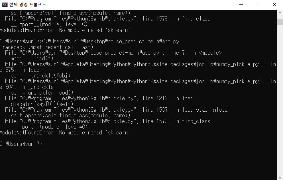 그래서 나는 pip가 이미 설치되어있어서 pip install sklearn 을 해줬는데 ,,,, 또 오류 발생 ,,,,,