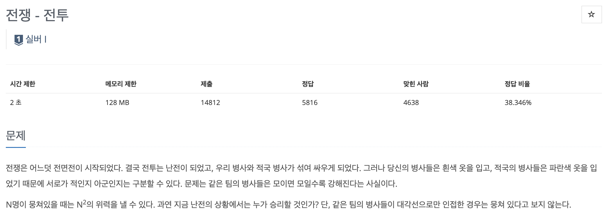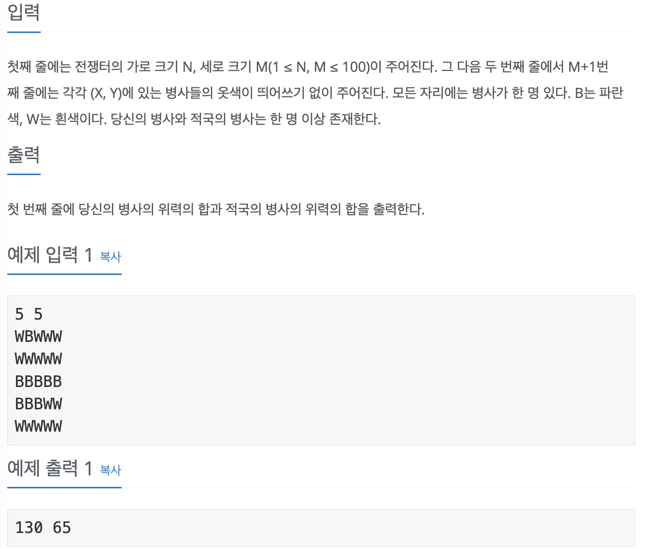 첫째 줄에는 전쟁터의 가로 크기 N, 세로 크기 M(1 ≤ N, M ≤ 100)이 주어진다. 그 다음 두 번째 줄에서 M+1번째 줄에는 각각 (X, Y)에 있는 병사들의 옷색이 띄어쓰기 없이 주어진다. 모든 자리에는